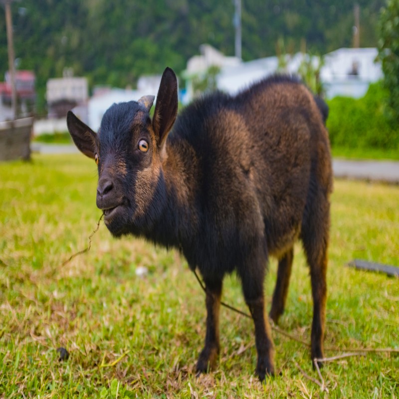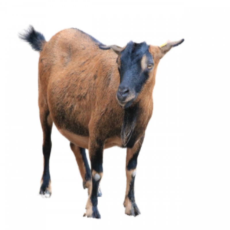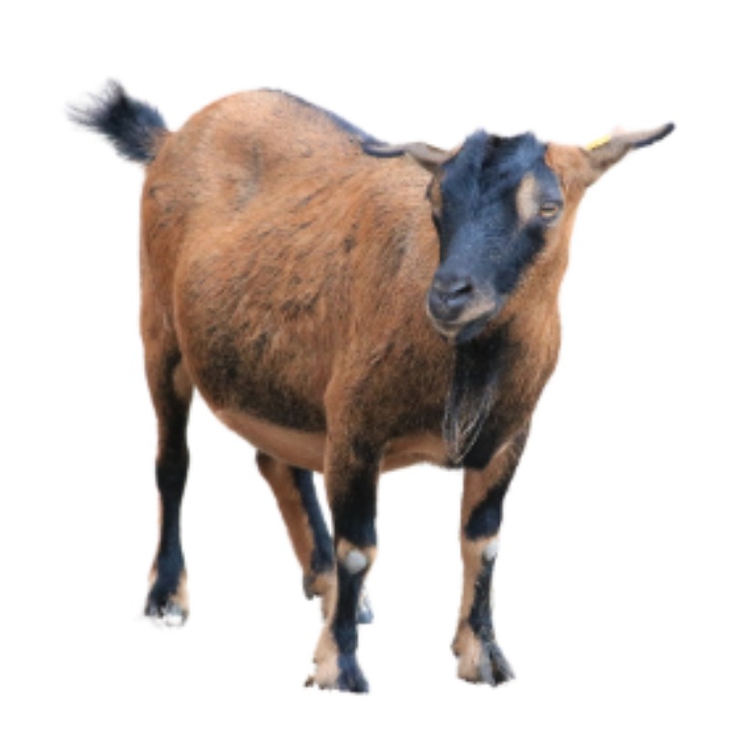 The West African Dwarf goat is achondroplastic, with a typical height of 30 to 50 cm (12 to 20 in). Adult males weigh 20 to 25 kg (44 to 55 lb) and females 18 to 22 kg (40 to 49 lb). Both sexes have horns, which curve outwards and backwards in males. Males also have beards and sometimes manes. Characteristics include a relatively long neck, broad chest, and straight back. Legs are short and the udder is small but generally well shaped. Most have short stiff hair, and color varies; dark brown with black points is probably the most common, but black, red, white, pied, and multi-colored goats also occur.